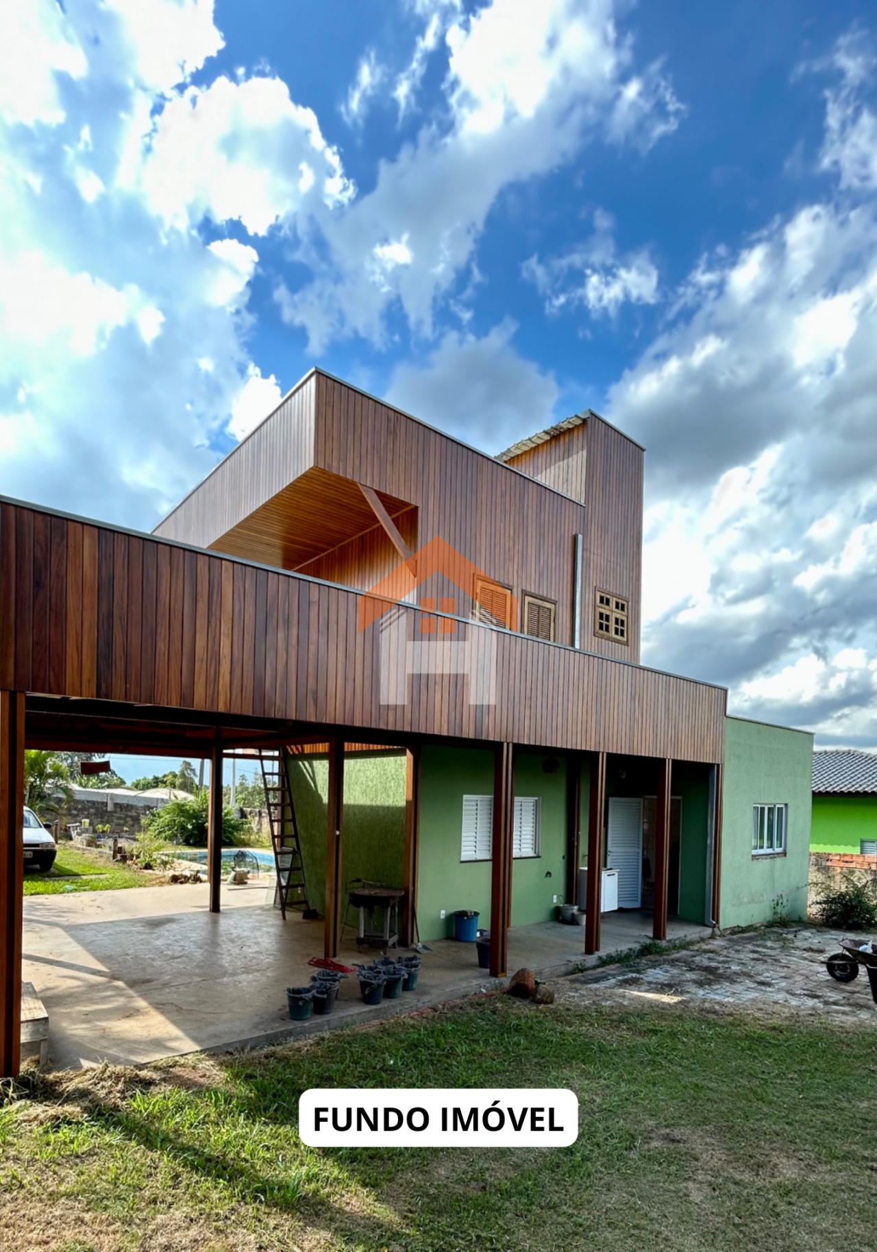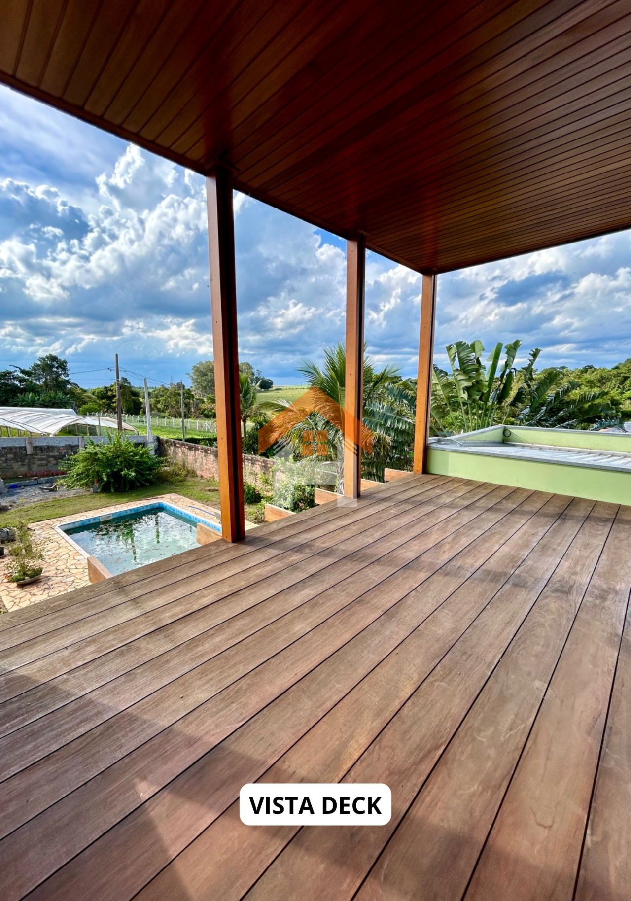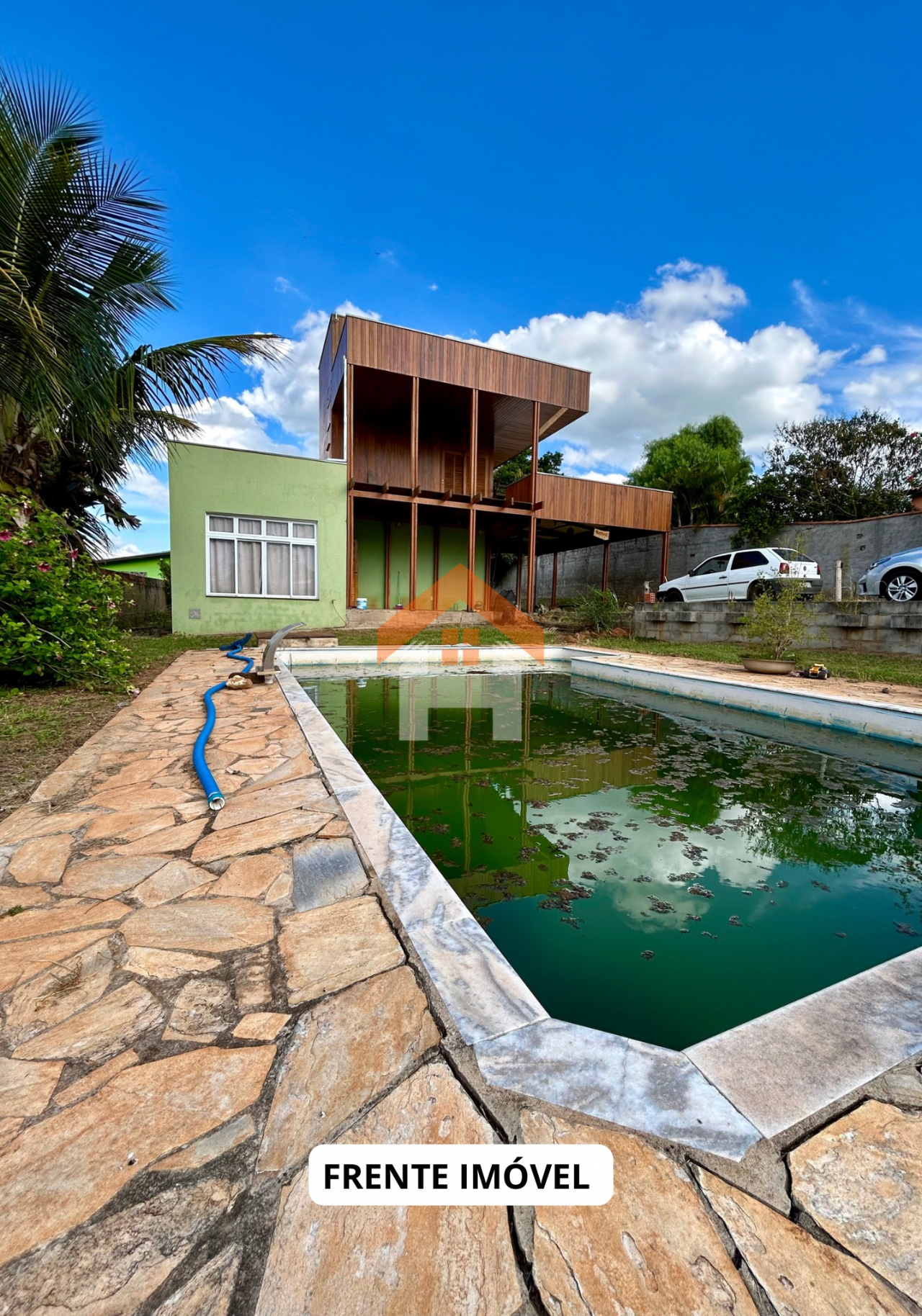 Ampla área verde, garagem coberta, piscina, cozinha, sala, um dormitório, banheiro, lavanderia, e na parte superior suíte com deck e linda vista